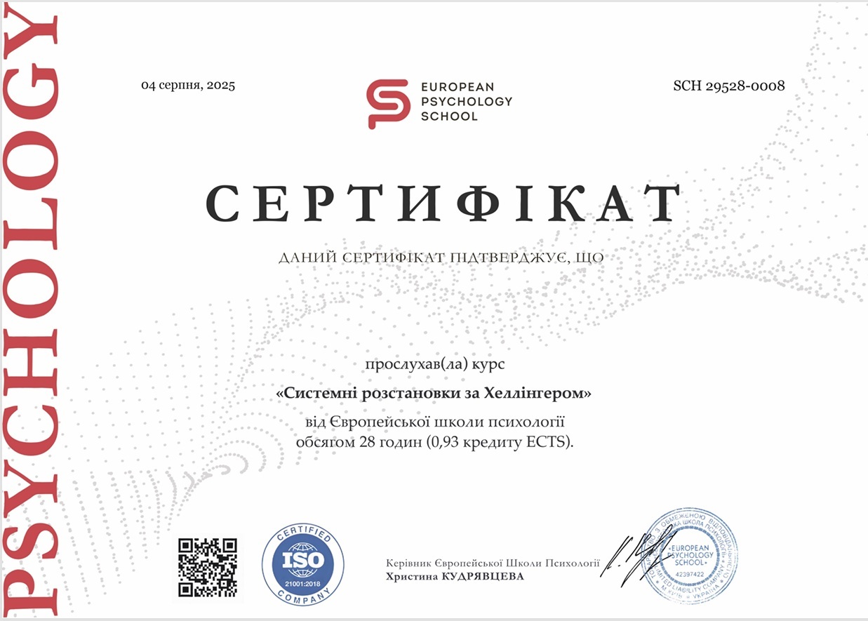 Вищу психологічну освіту я вирішила отримати вже у відносно зрілому віці. Психологія мене зацікавила тому, що мені було необхідно відповісти на власні питання про себе і своє місце в світі! Адже це так важливо для кожної людини!